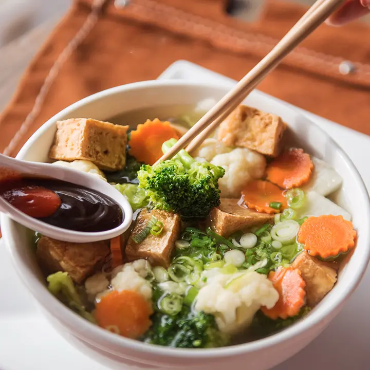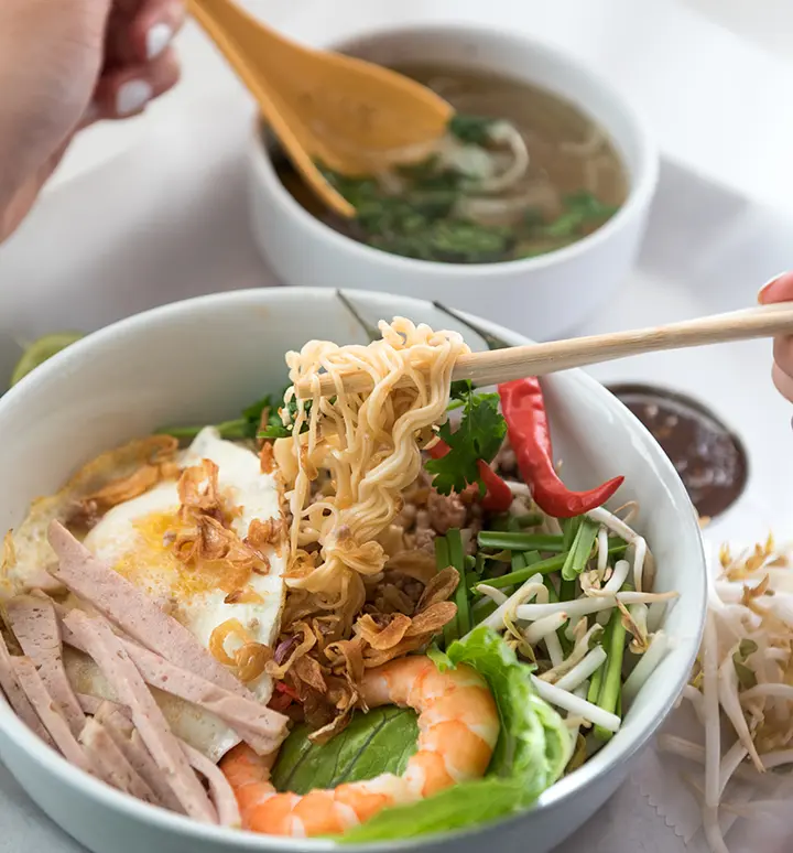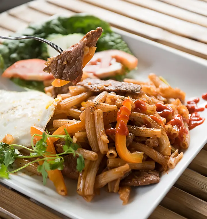Soft stir-fried egg noodles tossed with bell peppers, carrots, and protein of your choice, topped with tomatoes cucumbers, and cilantro.