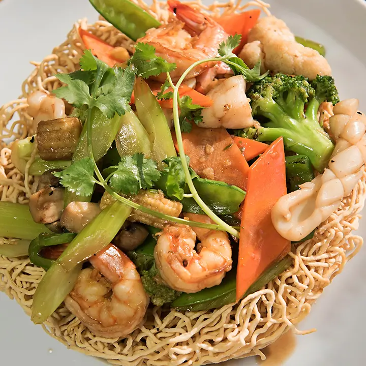 Fried egg noodles served with fishballs, shrimp, and squid, and veggies stir-fried with house sauce.