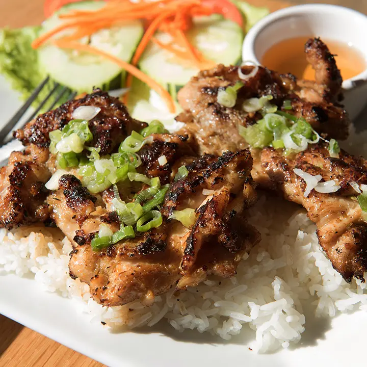 Bite sized pieces of stir-fried beef sauteed with homemade Vietnamese BBQ sauce, served over your choice of rice: