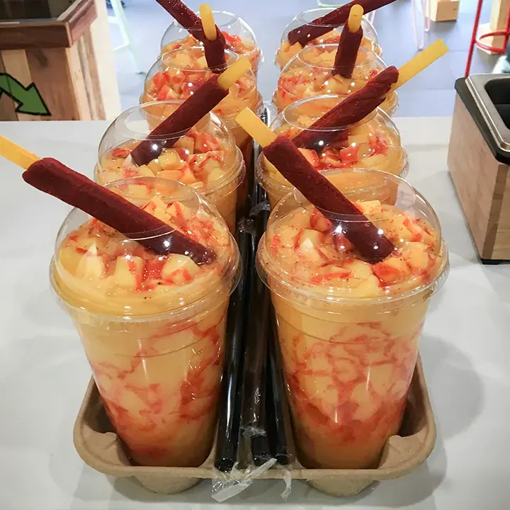 Similar to our Volcano Mango, this peach smoothie blend is poured into a cup drizzled with tangy Chamoy and topped with a tamarind candy straw.