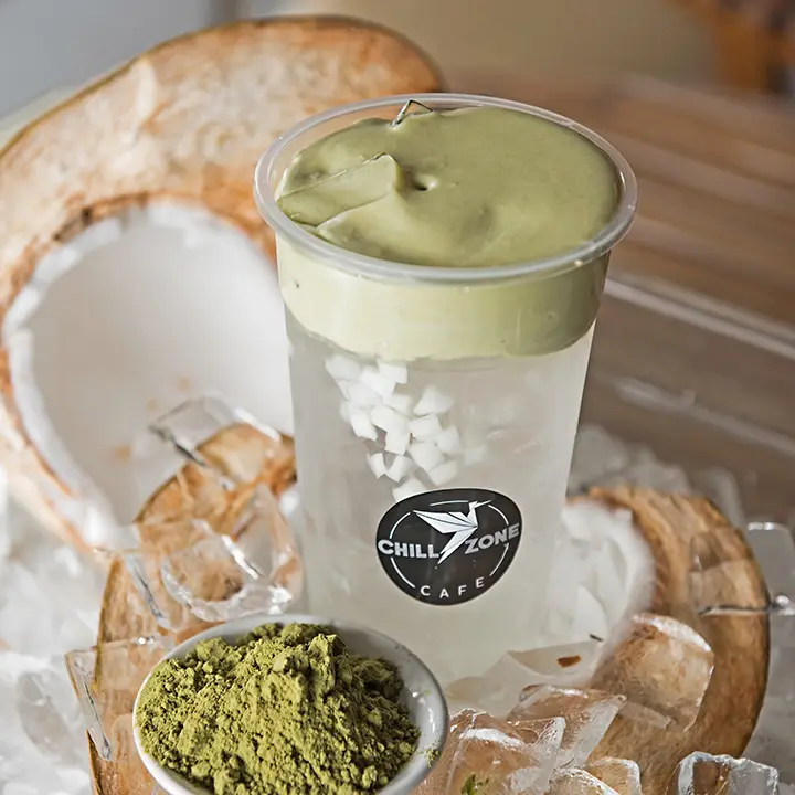 A rich matcha coconut cream topping layered over refreshing coconut juice.