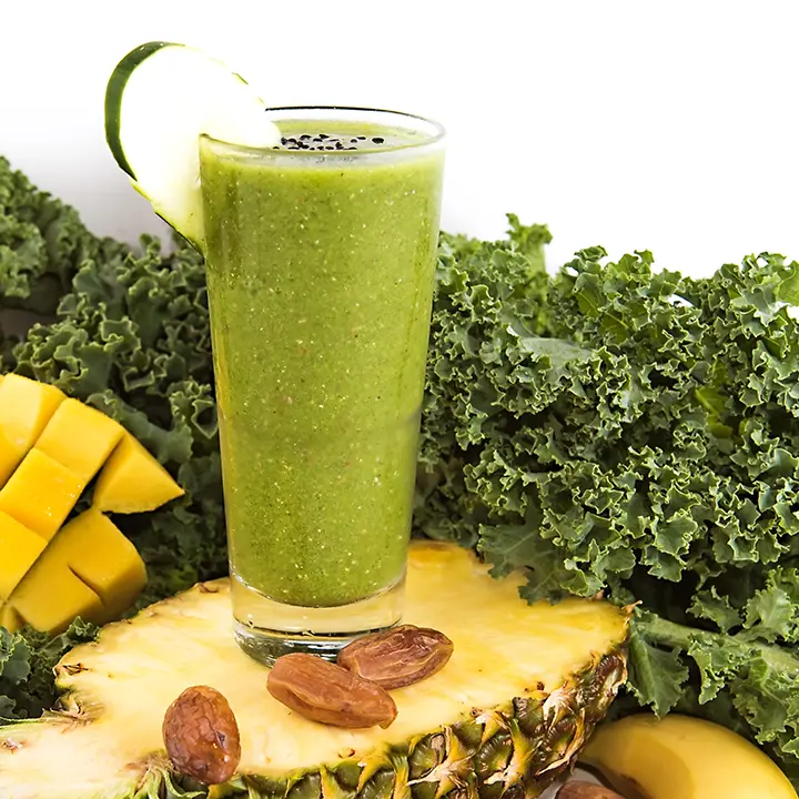 A healthy and nourishing green juice smoothie made with a kale base, blended with sweet pineapple and mango chunks, banana, chia seeds,and naturally sweet dates.