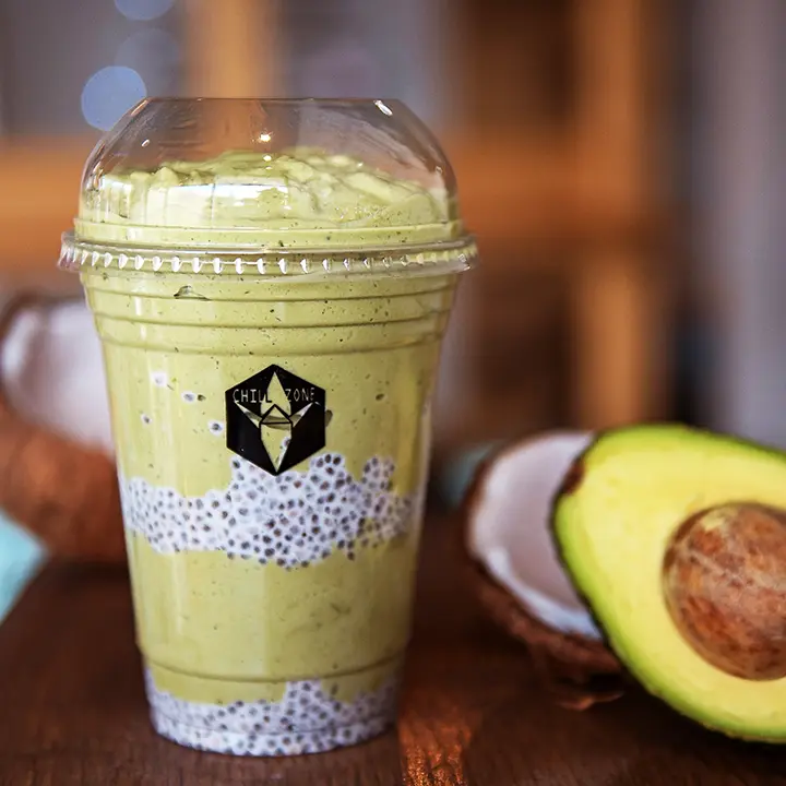 A smooth and creamy avocado smoothie blended with coconut milk, a hint of matcha, and lightly sweetened with condensed milk.