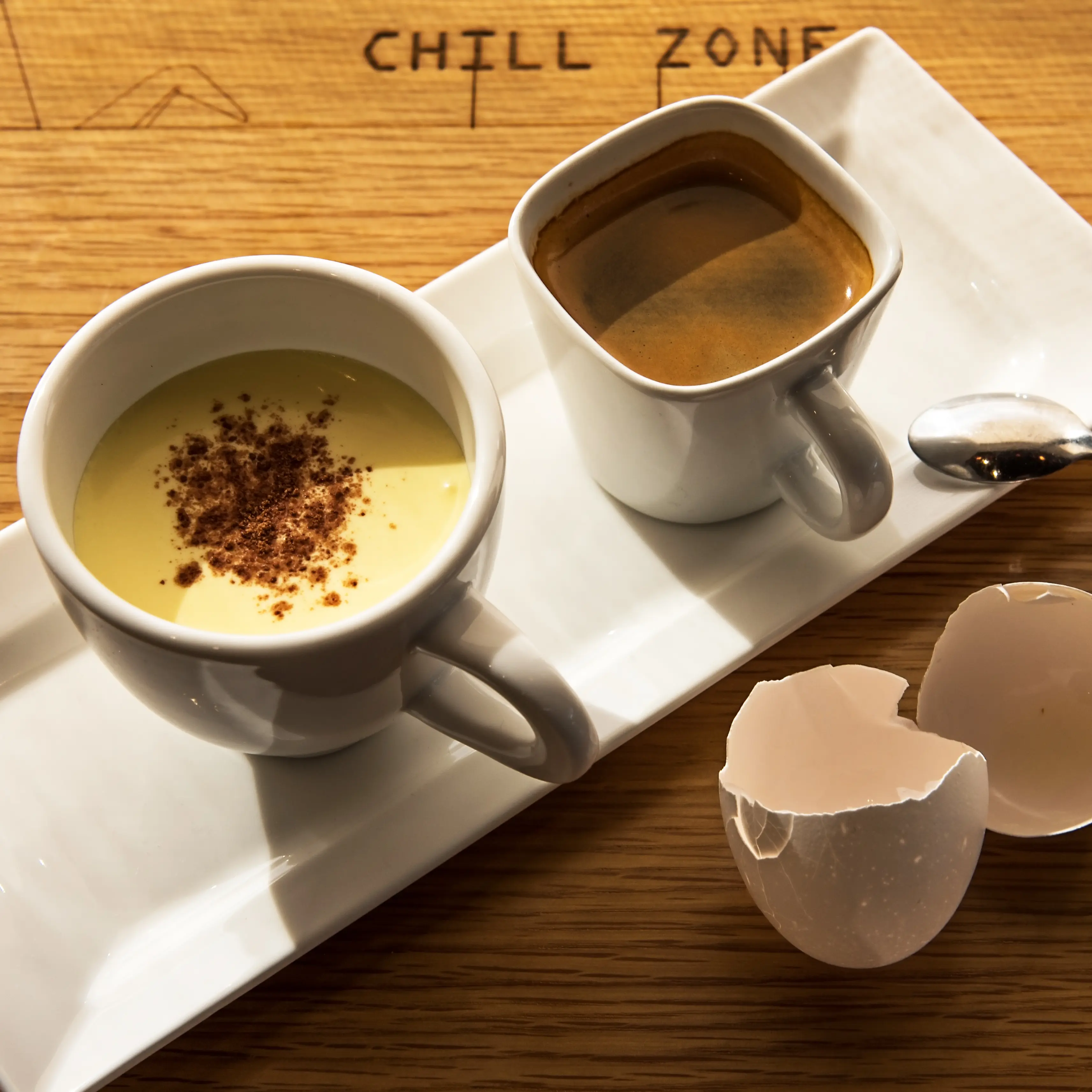Rich espresso mixed with warm housemade egg cream and a light dusting of Milo.