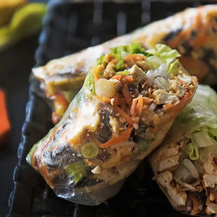 Pork, prawns, mushrooms, and vegetables deep fried, served on lettuce with pickled carrots and sweet chili sauce.